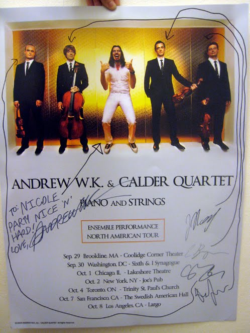 It all started when I first heard of Andrew WK. I remember watching "Party Hard" and "She Is Beautiful" on MTV after school one day. I've never seen anything like it before and loved it. For some crazy reason I never actually bought "I Get Wet" in high school and Andrew fell off my radar. Flash forward 7 or so years later when I'm out of college and on my second year internship in Washington, DC. I'm checking my email and I see that Andrew WK is playing a show at the Sixth & I synagogue in Washington, DC with Calder Quartet. Tickets were cheap and I thought it would be fun. A few weeks later the venue ended up changing to the middle of nowhere in Virginia. I was still determined to go. I took a metro and walked a few miles to the venue. It was a strange coffee shop/venue. I got some spinach and artichoke dip (good show snack right?) and sat down. The show was awesome. Andrew played piano and sung his classics that I still knew from high school, but he was backed by an amazing string quartet. They also played more classical arrangements. It was definitely a one of a kind show, so I just had to stay for the meet and greet afterward. I was in line and knew I would miss the last metro, but I stayed anyway. The quartet guys were awesome to talk to, but this post is about Andrew. He was so friendly and genuinely enthused to meet everyone. I got a signed poster and a picture and merrily went on my $60 cab ride back to the city.